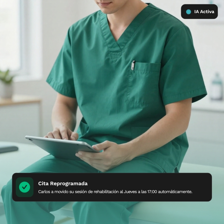 La IA resuelve dudas típicas sobre los ejercicios o el dolor post-tratamiento, y escala a al fisio solo lo realmente urgente.
